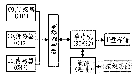 前端傳感器輸出的數(shù)字信號(hào),以串口方式與STM32進(jìn)行通訊,此儀器設(shè)計(jì)三通道采集,利用繼電器電路對(duì)傳感器通道進(jìn)行選擇,STM32將濃度值顯示在液晶屏上,液晶屏帶有觸摸功能,通過編寫液晶顯示界面,調(diào)用相關(guān)按鍵程序,選擇傳感器通道以及保存為U盤數(shù)據(jù)等功能。框圖如圖1所示。