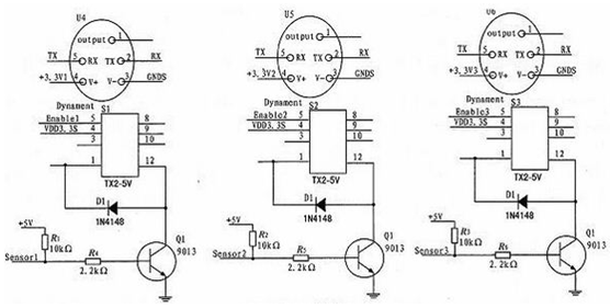 本儀器設(shè)計(jì)3個(gè)通道的二氧化碳傳感器采集,通過3個(gè)繼電器來選擇傳感器的通斷。如圖3為繼電器控制電路。